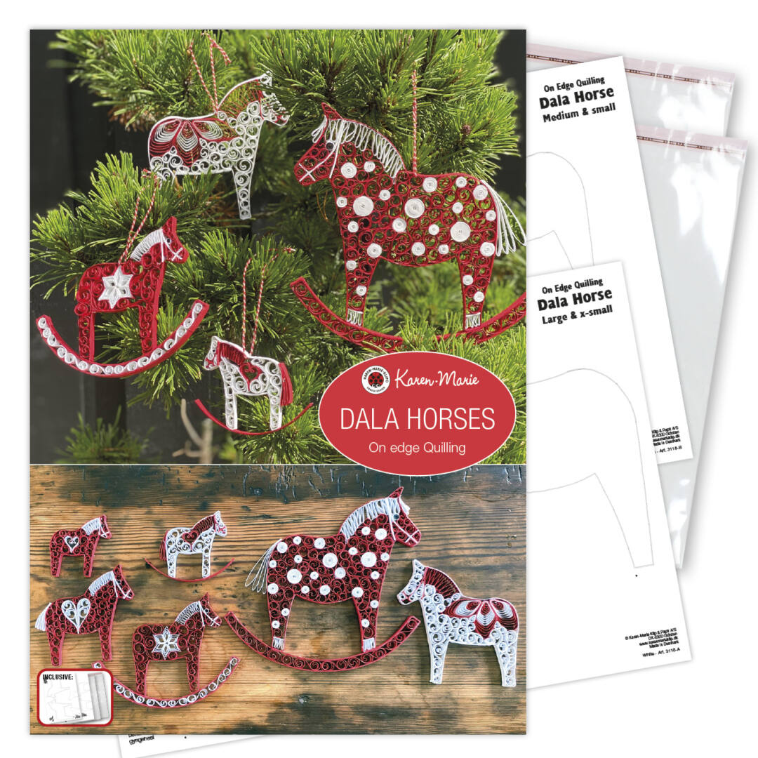 Eine 4-seitige Anleitung mit der Sie lernen, wie man Dalapferde in 4 verschiedenen Größen erstellt. Die schwedischen Dalapferde sind die Inspiration für diese gemütlichen Pferde – sie sind ideal für Weihnachten, aber auch im Allltag, je nach Farbe und Dekoration. Die Quilling-Pferde sehen auch als Dala-Schaukelpferd toll aus! In der Anleitung zeigen wir Basis-Techniken für Dalapferde als Aufhänger oder als On Edge Quilling und Schaukelpferde. Es wird das selbe Template für beides verwendet. Man kann wählen, ob man die Figur direkt auf das Template baut oder es mit On Edge Quillingstreifen auf der Schablone aufklebt. Um die Dekoration der Pferde zu erstellen, benötigen Sie zusätzlich die Anleitungen Inca Patterns & Art Nouveau Quilling Deco Elements. Schwierigkeitsgrad: 5 von 7. Zusätzlich wird benötigt: die Anleitung Inca Patterns, die Anleitung Art Nouveau Quilling Deco Elements, On Edge Dala Pferde Lampone Ausschneidebogen, Quilling Pen, Fine Comb, Triple Fine Comb (bestehend aus 3 Stk. Fine Comb), Double Superfine Comb (bestehend aus 2 Stk. Superfine Comb), Leaf Module Tools, Foamboard (A4), Papierkleber, Schere & Stecknadel.