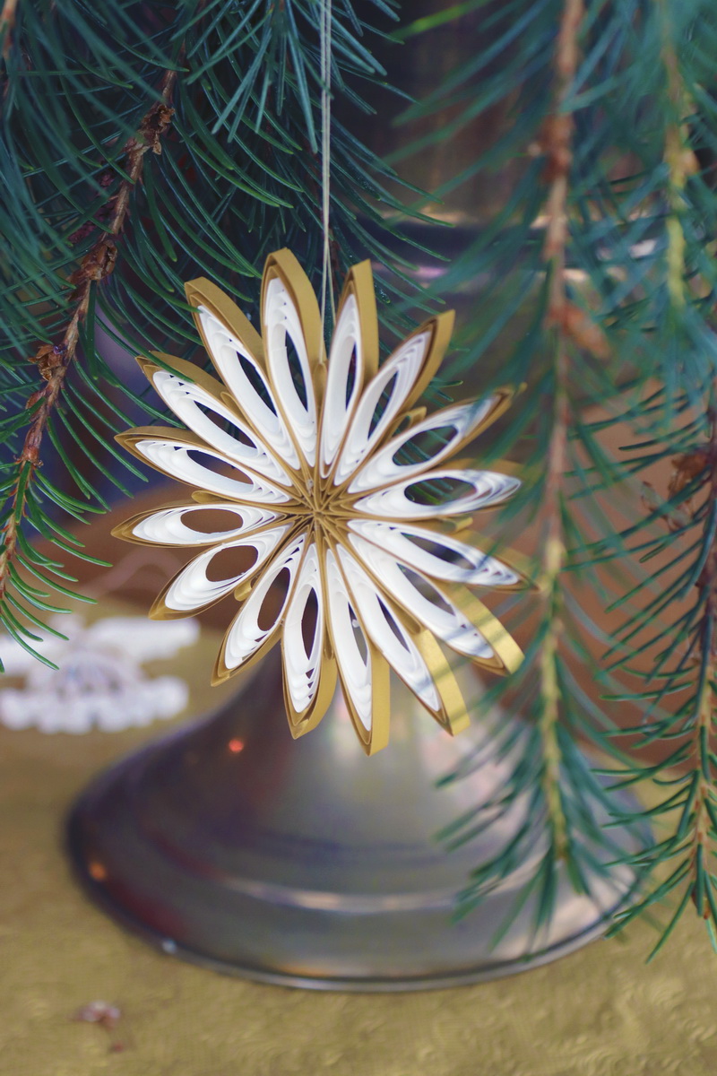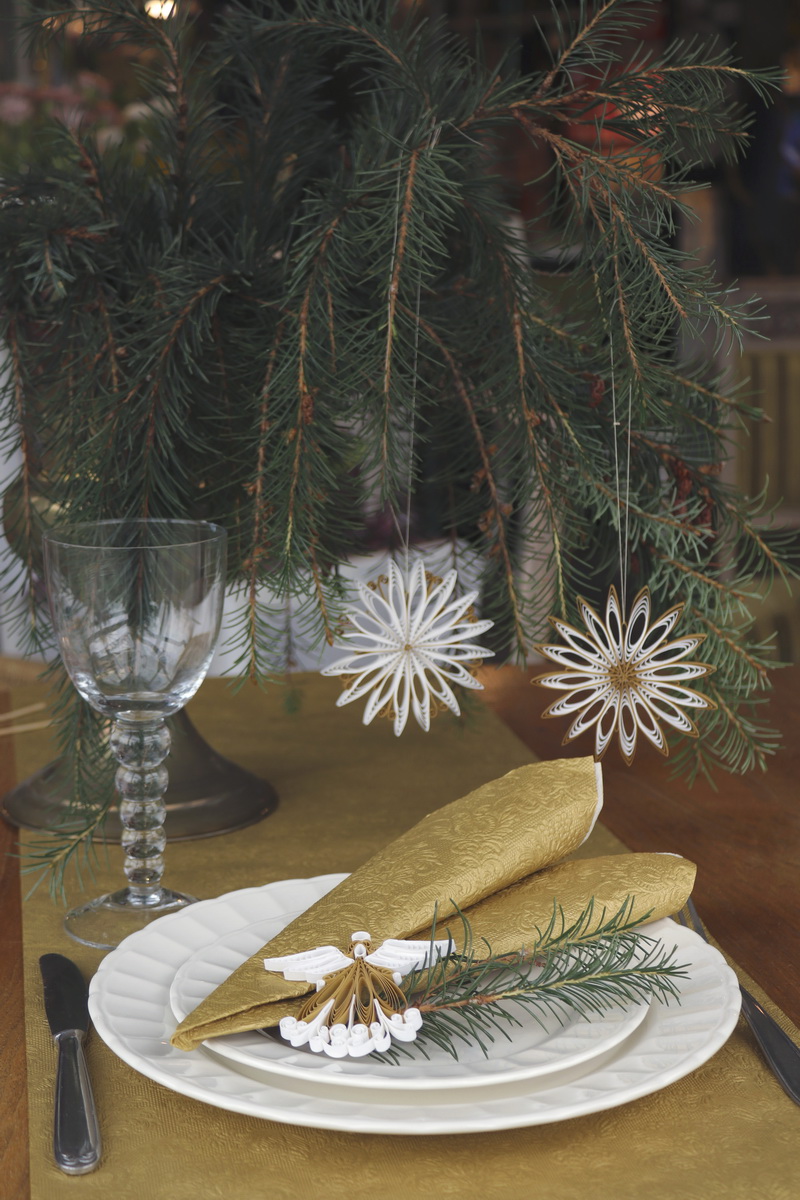 Feiner Quilling Stern Kit Inhalt 200 Streifen: 5 mm-Streifen in nature white und luxus gold, außerdem Anleitung mit 1/8 Maßboard und Feiner Quillingkamm