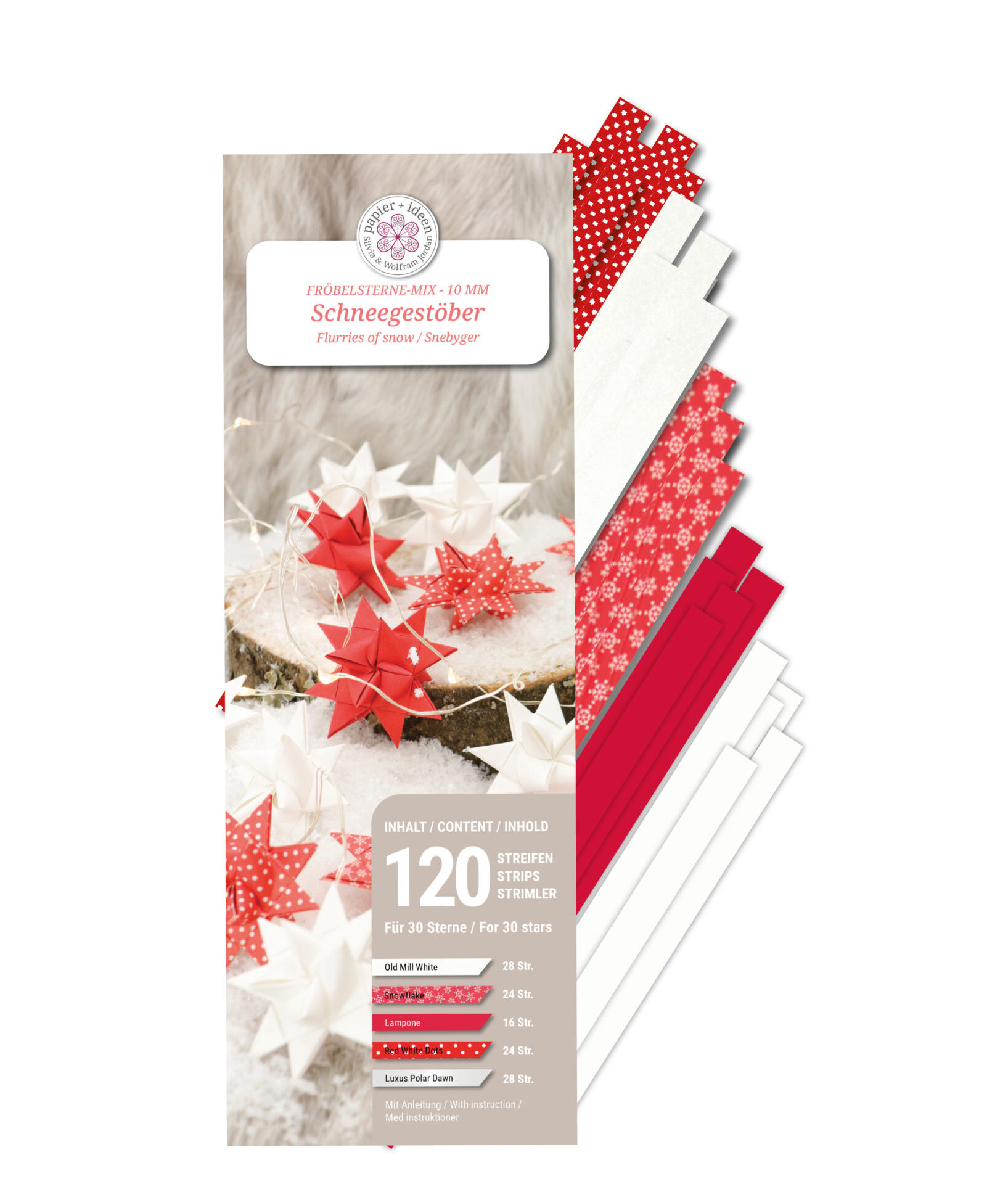 10 mm-Mixpack für Fröbelsterne Inhalt reicht für 30 Sterne mit Flechtanleitung beinhaltet 120 Streifen in den Farben Luxus Polar Dawn, Lampone, Red/White Dots, Red/White Snowflakes und Old Mill White