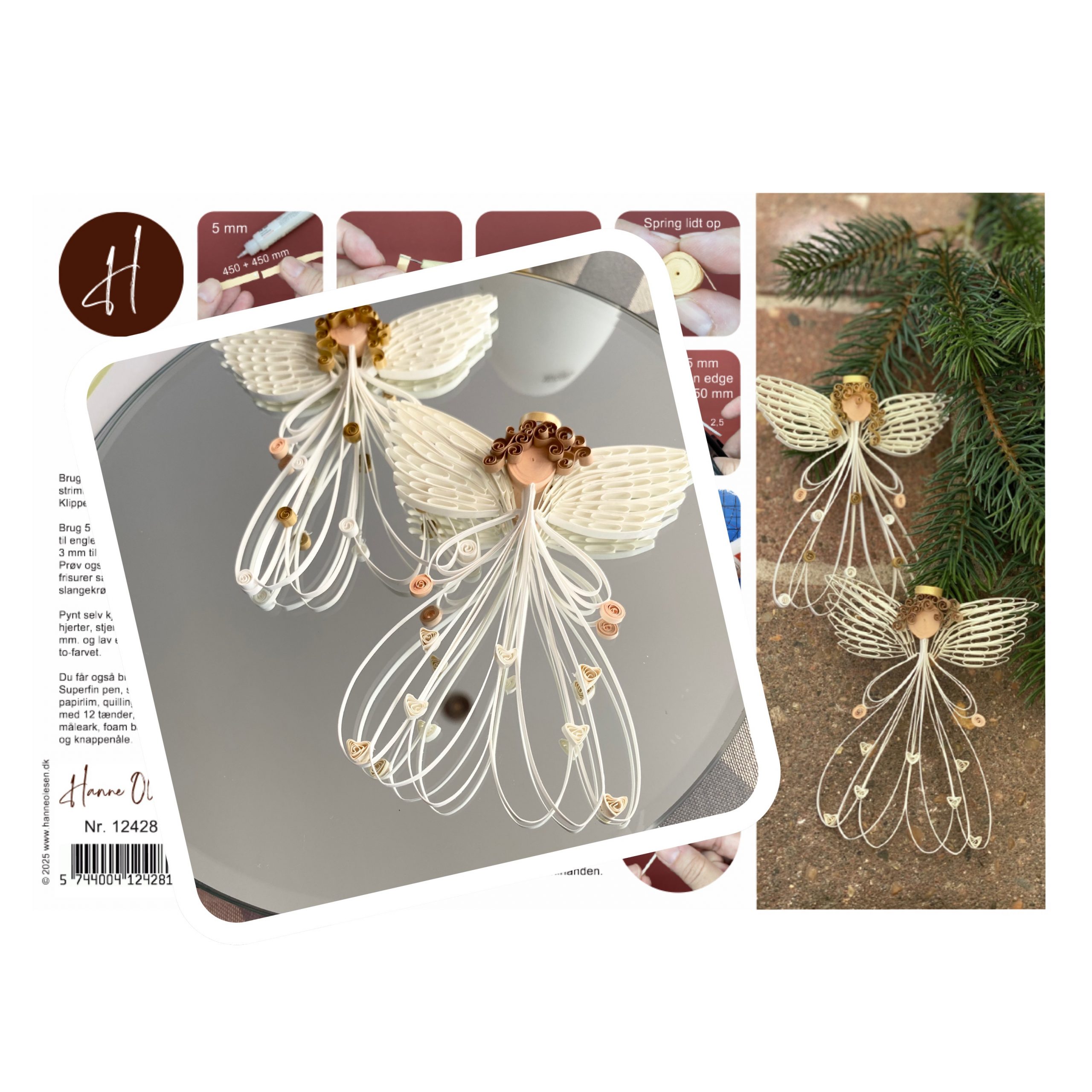 2 x A4 Blatt im Folienbeutel Modellgröße des Engels: Höhe 10 cm Enthält Schritt-für-Schritt-Bilder, Maße, 1:1-Modell, Ideenbilder und dänischen Text. Deutsche Übersetzung beigelegt. Sie benötigen außerdem: Superfeiner Stift, normaler Quilling-Kamm mit 12 Zähnen, Schere, Papierkleber, Lochschablone, Schaumstoffplatte, Messbogen und Stecknadeln,