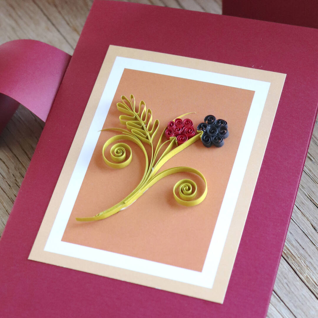 Ein Template mit verschiedenen Ideen inspiriert vom Spätsommer Thema. Auf dem template sind drei verschiedene 1:1 Aufhänger und drei kleine 1:1 Sträuße gezeigt, die man für Karten, Tischdeko und andere Dekoration verwenden kann. Die Aufhänger sind mit dem Leaf Module Tool gemacht (die Anleitung für die Ringe kann man auf dem Beiblatt vom Werkzeug finden). Es werden mehrere inspirierende Bilder für die Anwendung gezeigt, aber keine Schritt-für-Schritt Bilder. Die Anleitung für alle Elemente kann man in der Anleitung Late Summer Quilling Deco Elements erlernen (die Anleitung ist hier nicht dabei). Schwierigkeitsgrad: 4 von 7. Zusätzlich wird benötigt: Late Summer Quilling Deco Elements, Superfine Quilling Pen, Superfine Quilling Comb, 2x Fine Quilling Comb, Leaf Module Tool, Pinzette, 3 mm dobbeltseitiges Klebeband, 2 mm Klebestreifen, Papierkleber, Schere & Stecknadel. Es wurden 3 mm und 5 mm Papierstreifen in folgenden Farben verwendet: Arancio, Lampone, Bordeaux, Avocado & Black. Es wurden auch verschieden große Kartons in der Farbe Cherry für die Karten verwendet und 35 mm Papierstreifen in der Farbe Cherry für die Tischkarten.
