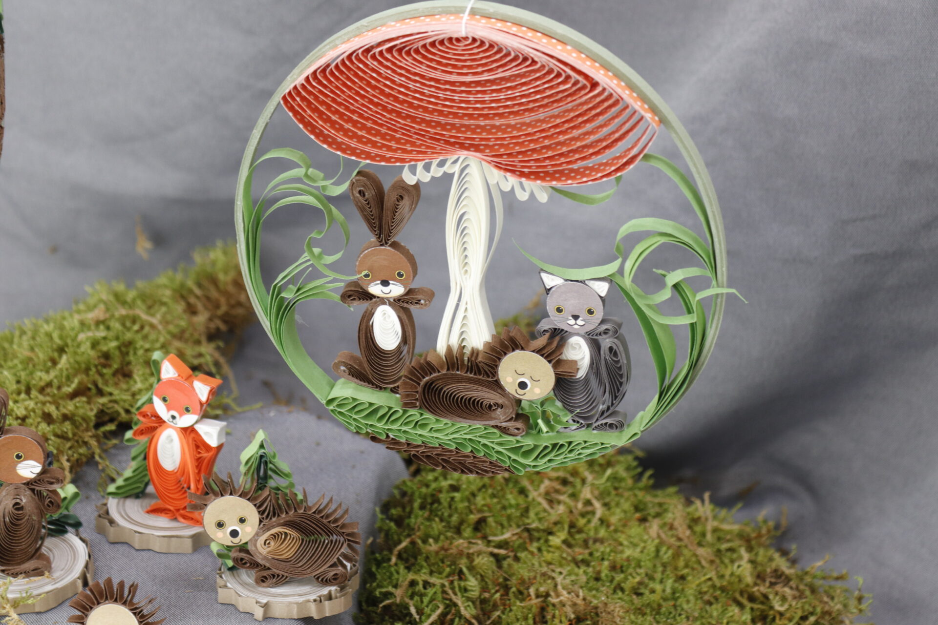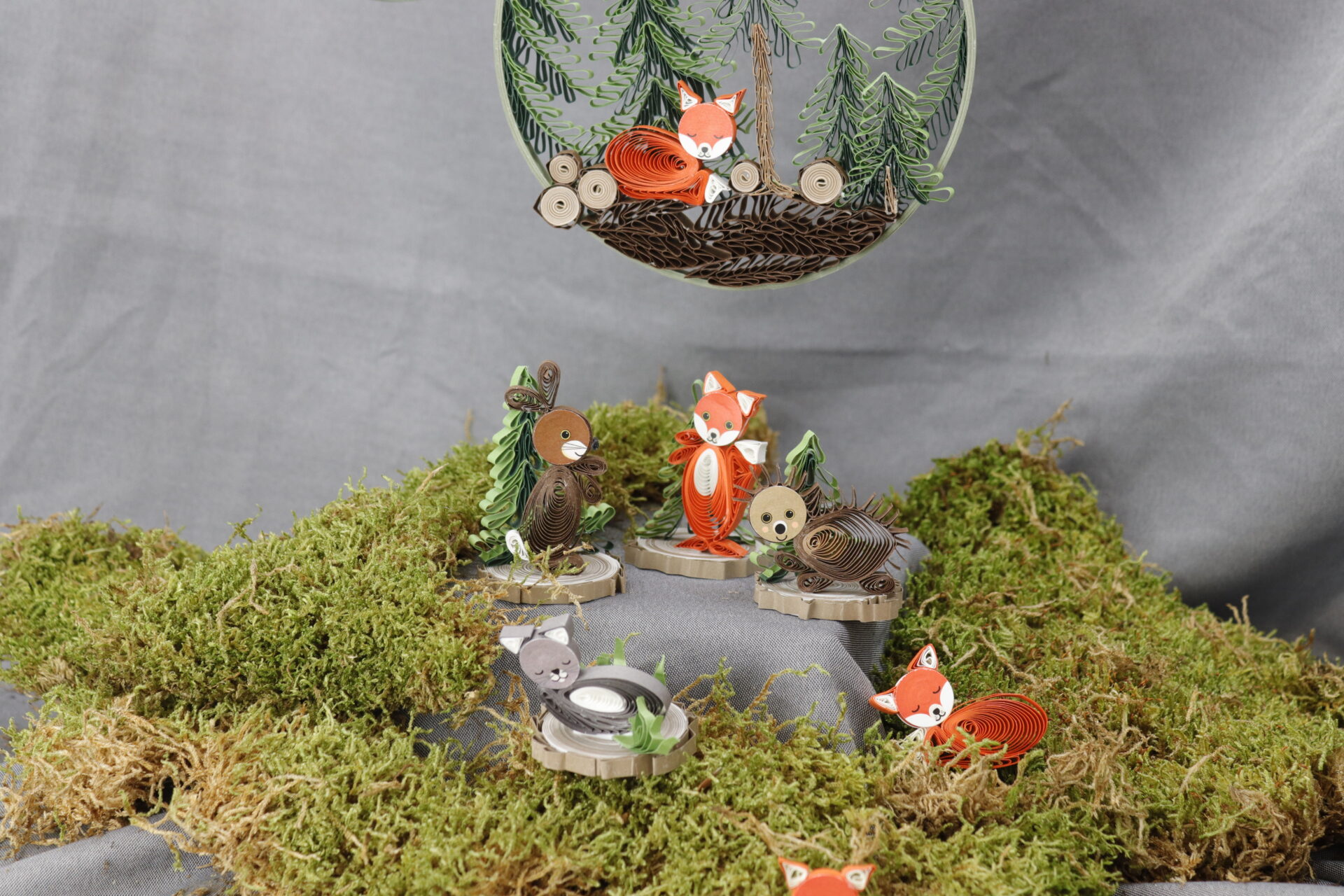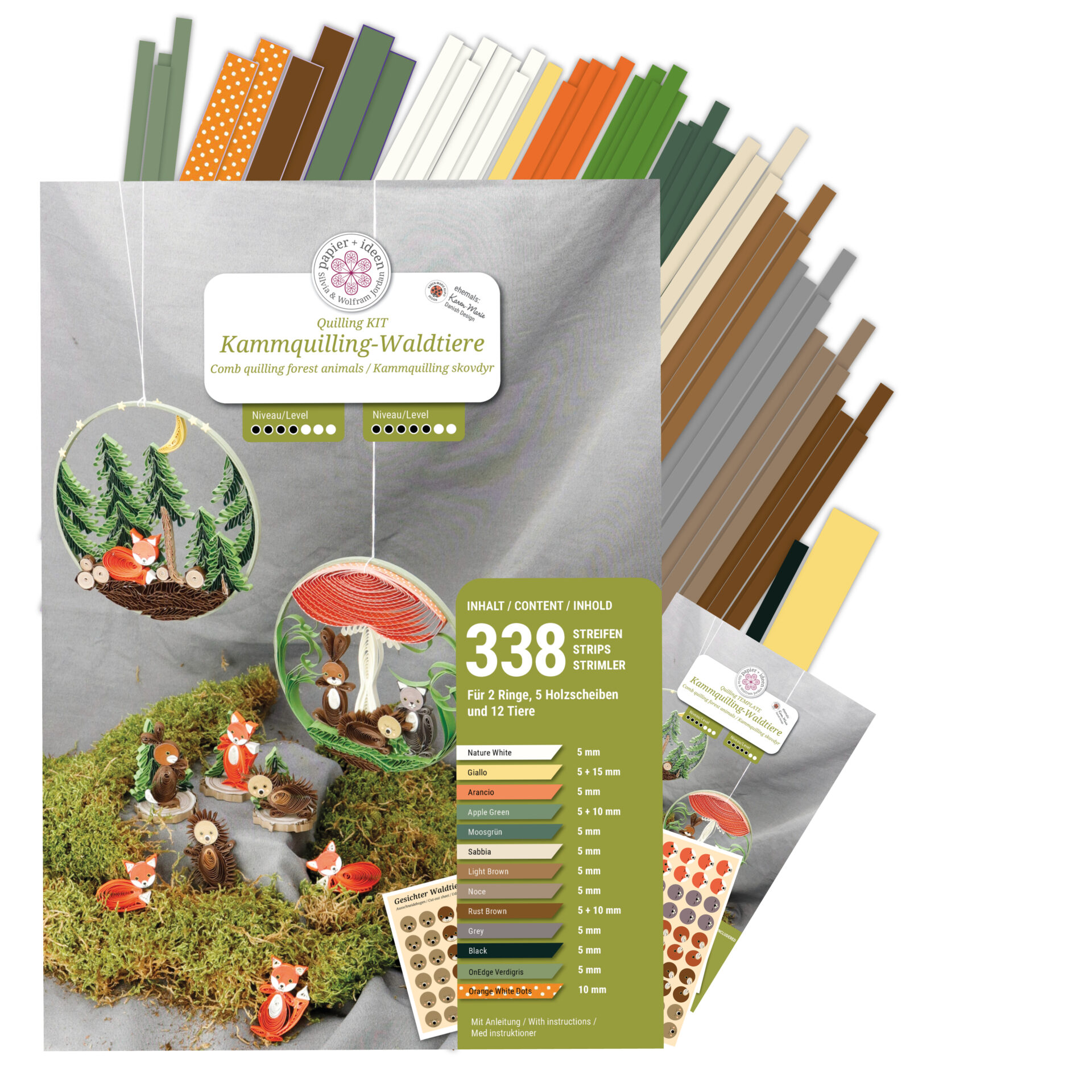 großes Kit mit Material für Waldtiere im Dekoring oder zum Hinstellen Inhalt: 338 Streifen in 5 bis 15 mm in vielen Herbstwaldfarben, Anleitung, Ausschneidebogen für Gesichter Waldtiere Anleitung enthält Schritt-für-Schritt-Bilder mit Text und 1 :1-Fotos Schwierigkeitsgrad: 4 bis 5 von 7