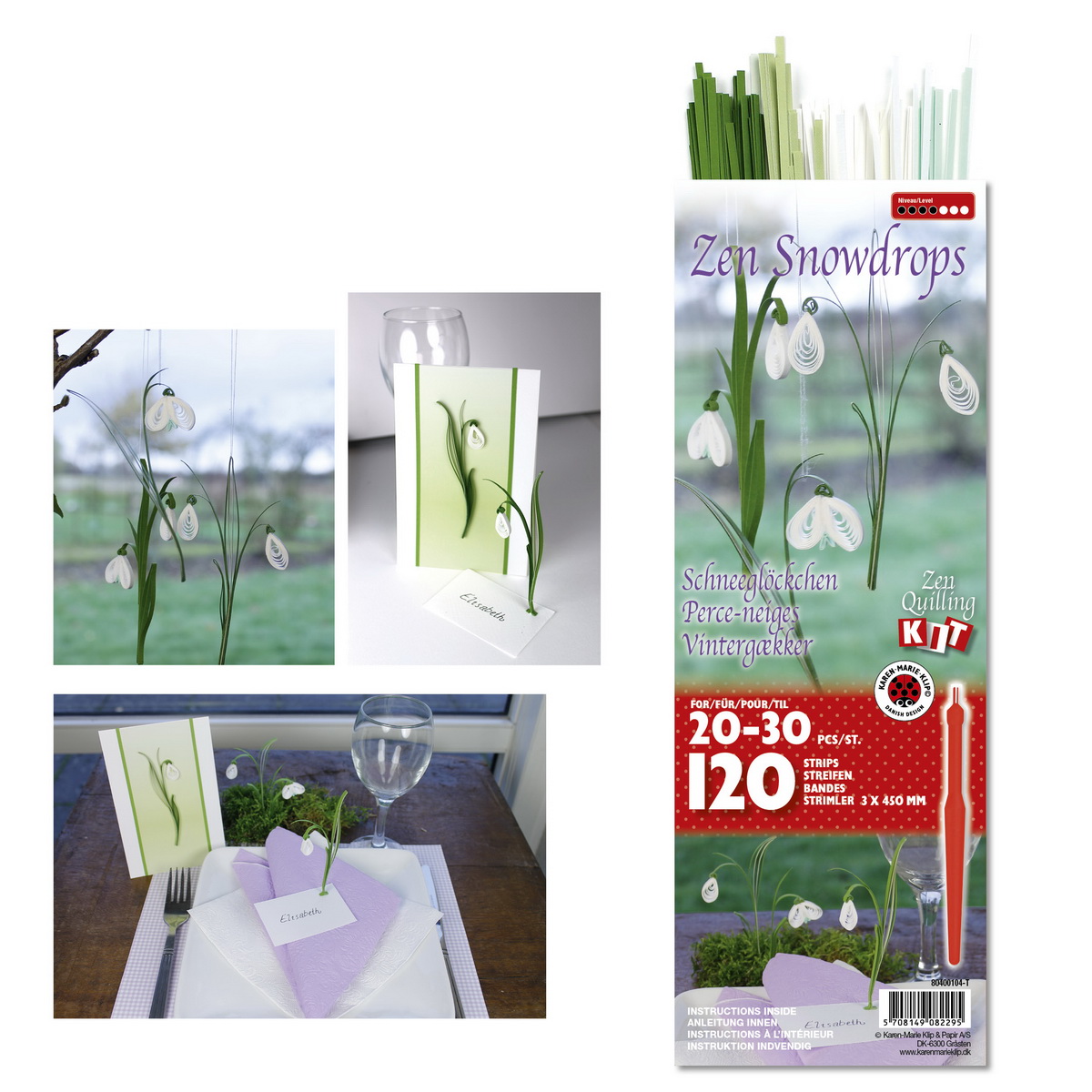 Streifenmix für zarte Schneeglöckchen * Inhalt: 130 Streifen in 3 mm in nature white, pistacchio light und apple green, Anleitung und Quillingpen * Schwierigkeitsgrad: 3 von 7
